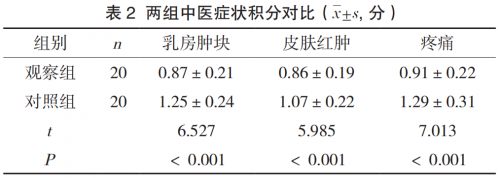 选取40例肉芽肿乳腺炎患者进行研究(纳排明确),随机分为观察组与对照组,各20例(P>0.05)。