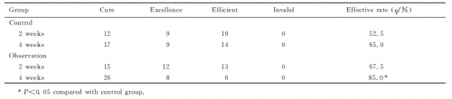 治疗2周时,观察组总有效率为67.5%,对照组为52.5%,2组总有效率比较差异无统计学意义(P>0.05);治疗4周时,观察组总有效率为85.0%,对照组为65.0%,2组总有效率比较差异有统计学意义(P<0.05)。见表1。