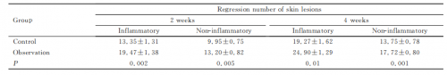 治疗2周后,观察组患者炎性皮损和非炎性皮损消退数目明显 多于对照组(P=0.002和P=0.005);治疗4周后,观察组患者炎性皮损消退数目和非炎性皮损消退数目也明显多于对照组(P=0.01和P=0.001)。见表 2。