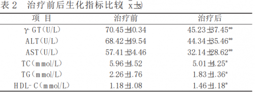 CT肝/脾比值改善情况治疗前0.76±0.90,治疗后0.93±0.78,P<0.05,治疗前后差异有统计学意义。临床痊愈16(26.67%),显效9(15.00%),进步20(33.33%),无效15(25.00%),总有效率为75.00%。