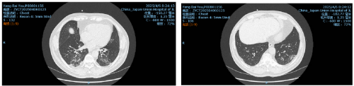 缘于1周前无明显诱因出现咳嗽、多为干咳,偶有少量黄白色痰,伴发热,体温最高39度,为持续高热,无明显寒战及畏寒,口服退热药物效果欠佳。就诊于当地诊所,应用药物具体不详,症状未见缓解,3天前出现胸闷、气短,夜间可以平卧,无双下肢水肿,现为求进一步诊治,门诊以“肺炎”收入我科,病程中,饮食、睡眠欠佳,无腹痛、腹泻及尿频、尿急、尿痛,近期体重未见明显变化。