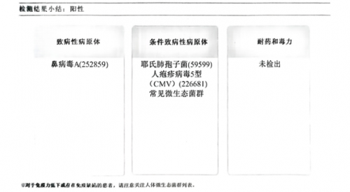 肺泡灌洗液NGS提示耶氏肺孢子菌(59599)、鼻病毒A(252859)、人疱疹病毒5型(CMV)(226681)。
