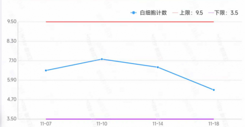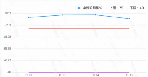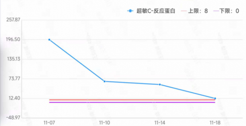 2025-11-07血常规5+CRP:白细胞计数:6.5*10E9/L,中性粒细胞%:84.0 1%,淋巴细胞%:13.6 1%,单核细胞%:2.3 1%,嗜酸性粒细胞%:0.11%,血红蛋白量:111g/L,超敏C-反应蛋白:196.5 mg/L。