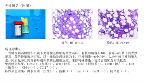 患者反复发热,完善BM象提示: 粒系比例增高,核左移,结合骨髓活检结果提示以分叶核巨核细胞为主,间质见多灶肉芽肿形成并多核巨细胞反应,未除特殊感染。