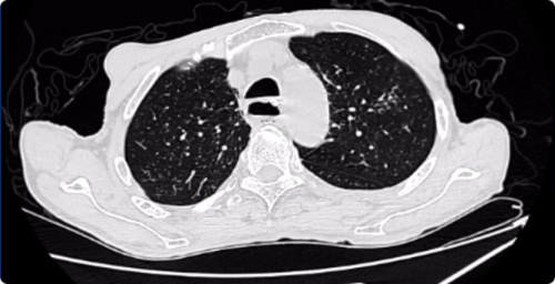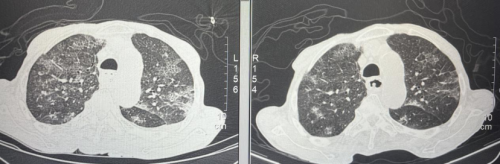 患者仍反复发热,鼻导管2L/mim吸氧下血氧98%,进一步抗结核治疗后体温正常,病灶吸收好转后出院。