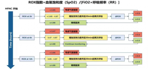 ROX临界值:90/0.75*20=6大于4.88,予以继续高流量辅助呼吸,继续监测。