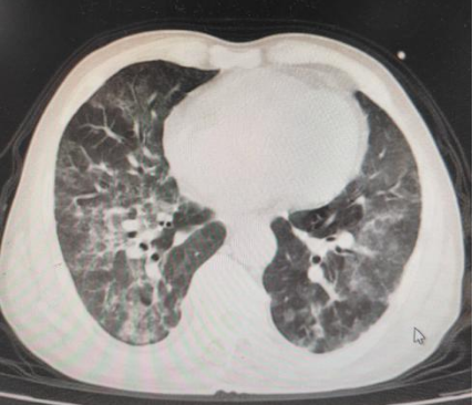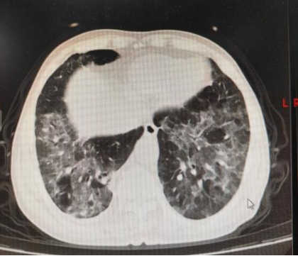 患者于来院一周前,着凉后出现咳嗽,咳少量白痰,伴间断发热,最高体温38.0℃,无胸痛咯血,无腹痛腹泻,当地社区诊所予头孢菌素类药物治疗,无明显好转,出现呼吸困难,就诊于当地中心医院,行肺部CT检查示双肺呈间质性改变、呈弥漫性渗出改变。患者呼吸窘迫明显,为求进一步诊治送至我院急诊,病来精神萎靡,食欲睡眠差,大小便如常,近期体重无明显变化。