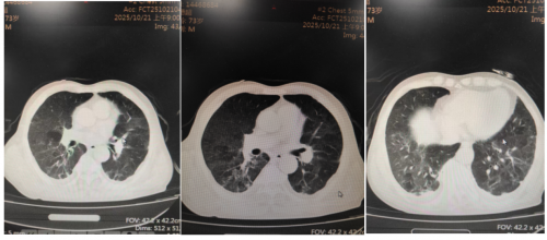 胸部CT平扫(2025.10.17):双肺多发模糊斑片影。右肺上叶点状致密影。