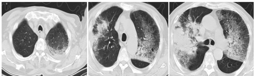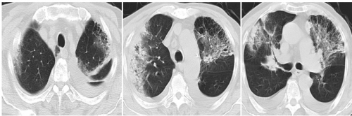 10.5日我院肺ct:肺ct显双肺片状、大片状高密度影,左侧可见少量胸腔积液。较自带肺ct明显进展。