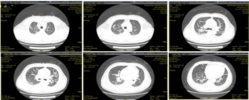 4天前患者受凉后出现发热,最高体温39.7℃,呈阵发性,用“退热药物”后体温能恢复正常,伴咳嗽、咳痰,灰色痰,感胸闷、乏力,头部、前胸、后背及四肢疼痛,诉有烧心、恶心不适,无头晕,无心慌、心前区压榨感,无咯血,无腹痛、腹胀、腹泻等不适症状,就诊于外院,完善胸部CT提示“肺部感染(未见相关报告及影像)”,给予输液治疗2天(应用药物患者及家属不能提供)。入院当天患者再次出现发热,体温39.1℃,自服“布洛芬”后来我院急诊,完善胸部CT提示“肺部感染”,故以“肺部感染”送入我科。此次发病以来,精神欠佳,进食欠佳,睡眠欠佳,二便正常,体重无明显变化。