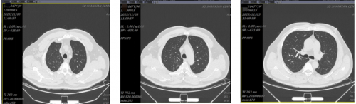 11月3日复查胸部CT:肺内感染治疗后复查所见,较前呈吸收好转改变;双肺纤维灶、微小结节灶。