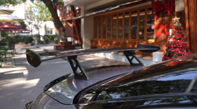 尾翼依然是那个三段可调碳纤维款,0度、8度、16度三档可调。碳纤维的纹路在阳光下很明显,质感确实不错。16度的时候高高扬起,从后面看过去很有性能范儿。