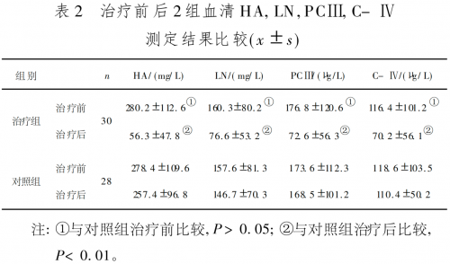 治疗组治疗后HA、LN、PCIII、C-IV水平显著下降(P<0.01),对照组仅轻微改善(P>0.05)。详见表2: