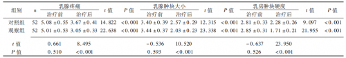 治疗前,两组的评分比较差异无统计学意义(P >0.05),治疗后,两组患者的乳腺疼痛、乳腺肿块大小、乳房肿块硬度评分均较治疗前降低(均P<0.05),且观察组的评分均低于对照组(均P<0.05)见表1。