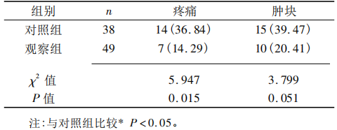 到随访1年时,对照组因各种原因失访14例,观察组失访3例。观察组疼痛复发率低于对照组(P<0.05) ,但两组间肿块复发率比较差异无统计学意义(P >0.05) ,见表2。