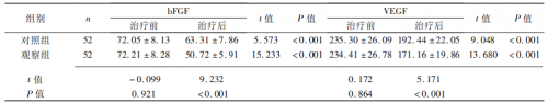 表3 治疗前后两组血清bFGF和VEGF水平比较