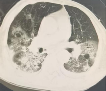 2025-10-28复查胸部CT:气管插管术后,气管腔内可见高密度影附着。桶状胸廓,双肺可见多发类圆形无壁及薄壁透光区,双肺内可见散在斑片状稍高密度影,边缘模糊不清,部分实变。双侧胸腔内可见弧形液体密度影,右侧为著。主动脉及冠状动脉走行区可见致密影。双侧胸腔内未见积液。