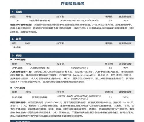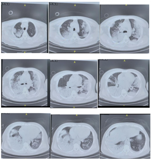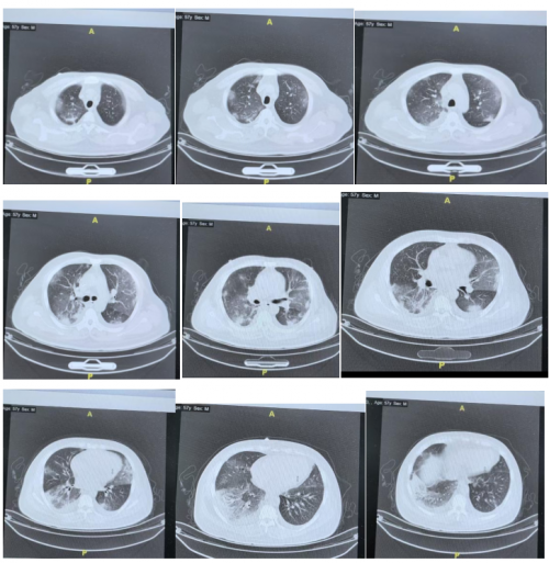 12月5日患者外送NGS血和痰的结果显示:新冠病毒阳性。同时调整抗生素为美罗培南联合莫西沙星。加用抗病毒口服药物先玛特伟。其他治疗未调整。治疗期间氧合指数逐渐好转,12月6-7日患者无创呼吸机高流量交替使用,呼吸支持条件下调,12月8日患者更换为鼻导管吸氧,可维持SPO2:95%。同时复查肺部CT:肺部病变明显好转。12月11日患者出院,转入血液科继续治疗骨髓瘤。