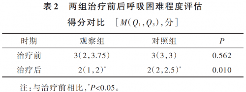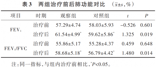 治疗后,西黄组的呼吸困难程度评估得分较对照组下降趋势更明显,且FEV1和FEV1/FVC改善较对照组更显著,P<0.05,见表2和表3。